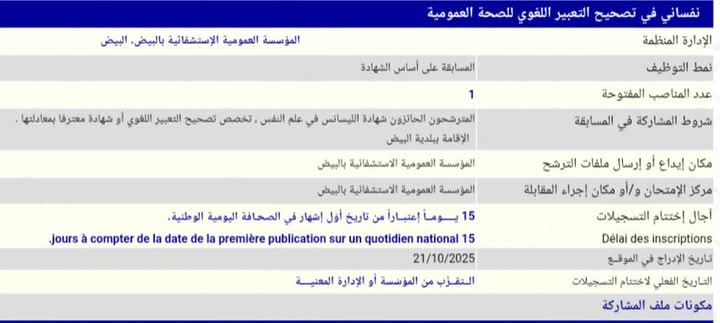 · المؤهل المطلوب: حاصل على شهادة ليسانس في علم النفس، تخصص “تصحيح التعبير اللغوي” أو ما يعادلها